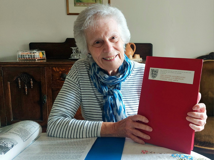 Vicky Jordan is seen below with the History Society's copy of Volume XX of the Victoria County History, entitled The South Oxfordshire Chilterns: Caversham, Goring, and Area.